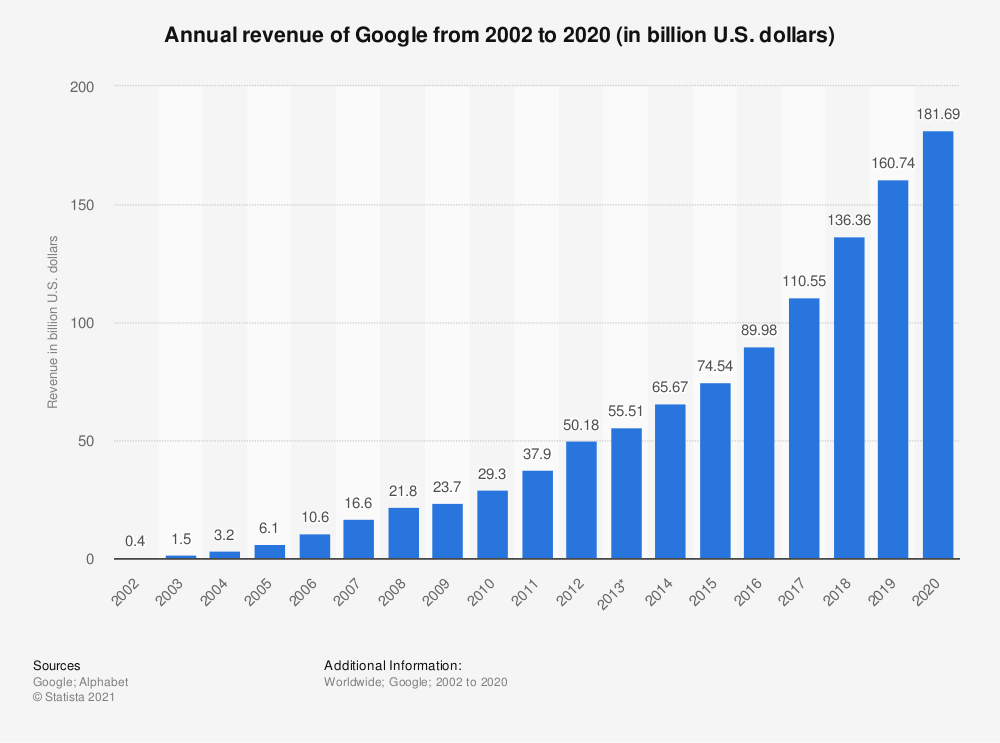 Google Advertising Revenue was 181.69 billion in 2020, up from 74.54 billion in 2015. Search Engine Optimization is improving the quality and quantity of traffic to a website or a web page from search engines. SEO targets unpaid traffic (known as “natural” or “organic” results) rather than direct traffic or paid traffic. Unpaid traffic may originate from searches such as map, image, video, or news searches.